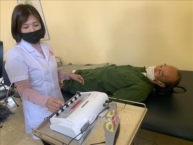 Nhân viên điều dưỡng sử dụng máy điện xung, phục hồi sức khỏe cho nạn nhân da cam.