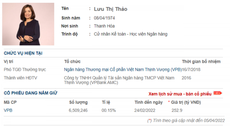 Hiện nay thì sau giao dịch "quên" đăng ký trên , bà Thảo còn nắm giữ 6.509.246 cổ phiếu VPB, giảm tỉ lệ nắm giữ từ 0,145% xuống 0,144%.