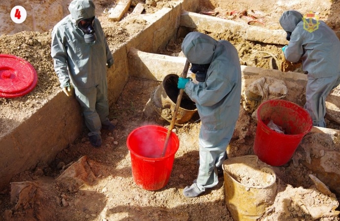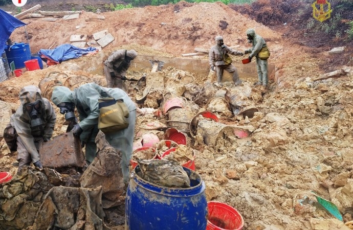 Đào xúc đưa các phương tiện, đạn dược, thùng, can... có chứa chất độc CS đã bị rỉ sét để dưa về phân loại chờ xử lý.