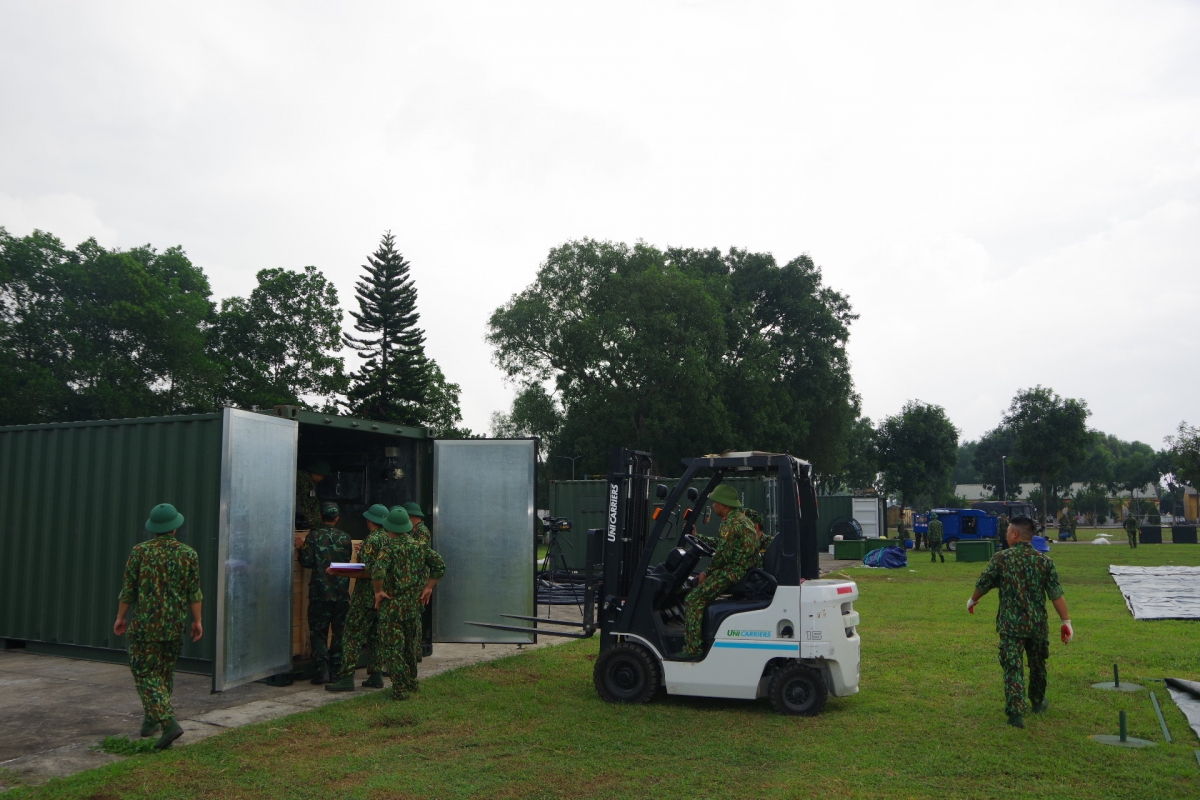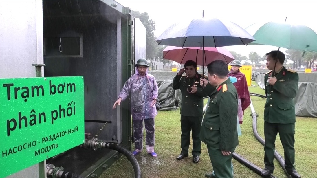 | Cán bộ chiến sĩ Kho xăng dầu 661, thuộc Cục Xăng dầu - Tổng cục Hậu cần đang giới thiệu các nội dung để triển khai Kho xăng dầu dã chiến PSG-600 |