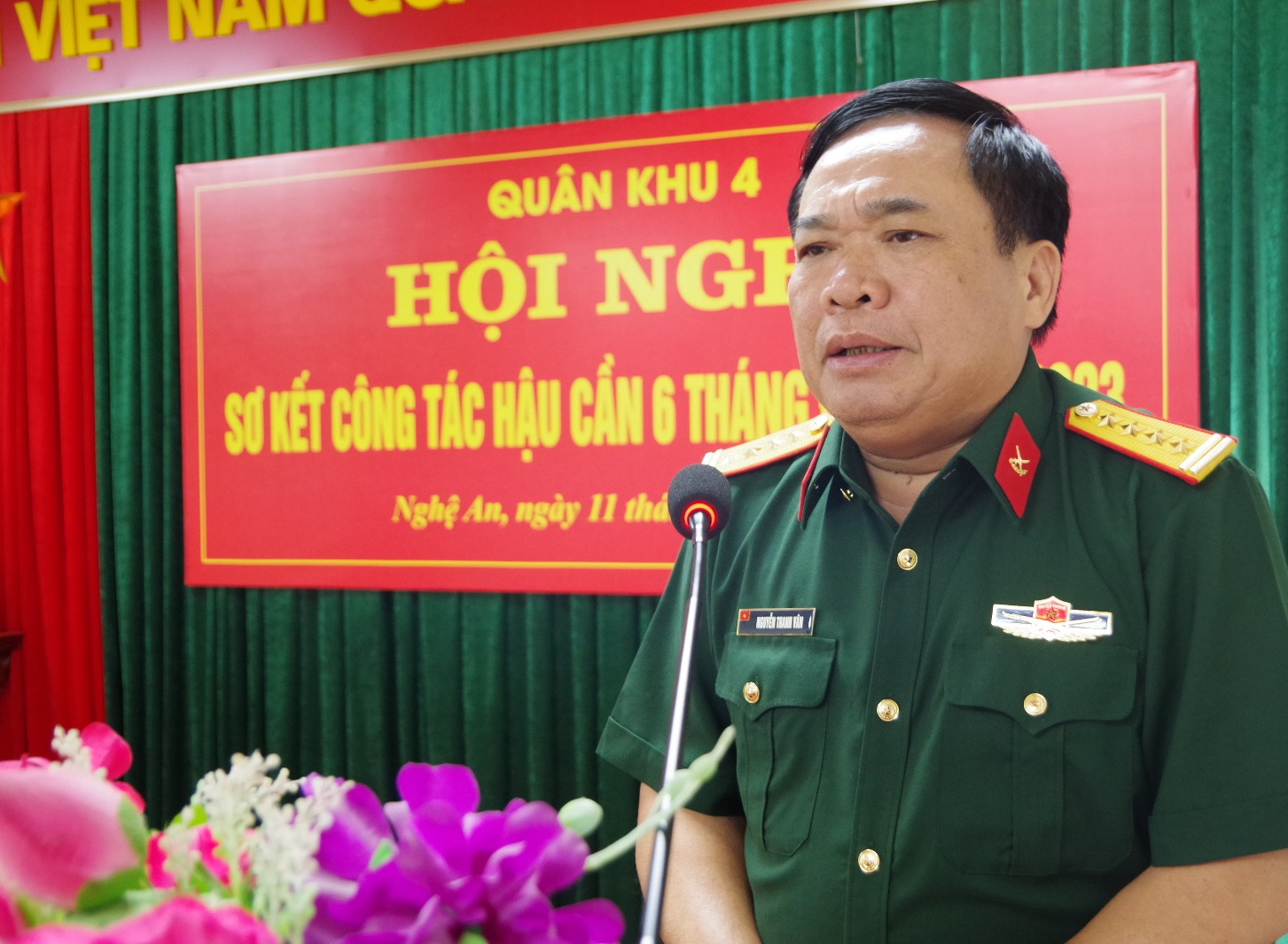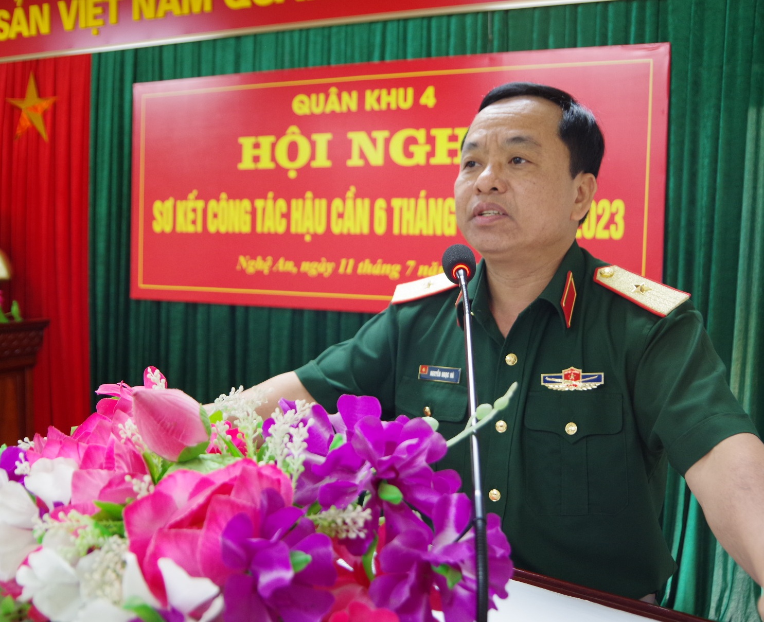Phát biểu chỉ đạo Thiếu tướng Nguyễn Ngọc Hà, Phó Tư lệnh Quân khu ghi nhận, biểu dương, đánh giá cao những kết quả đạt được của công tác hậu cần 6 tháng đầu năm 2203. Sáu tháng cuối năm 2023, đồng chí Phó Tư lệnh Quân khu đề nghị: Ngành Hậu cần các cơ quan, đơn vị duy trì nghiêm nền nếp, chế độ công tác hậu cần, dự trữ đầy đủ, quản lý, bảo quản tốt vật chất, trang bị hậu cần. Chỉ đạo các đơn vị chuẩn bị đầy đủ các nội dung về hậu cần cho diễn tập khu vực phòng thủ, phòng thủ dân sự các tỉnh Hà Tĩnh, Quảng Bình, Quảng Trị; diễn tập CH-CQ1 bên 2 cấp sư, lữ đoàn. Tiếp tục phát huy vai trò của Hội đồng giá, tổ kinh tế các cấp; bảo đảm đầy đủ định lượng ăn cho bộ đội. Tổ chức lắp đặt bếp dầu, bếp điện theo kế hoạch, tiến hành kiểm định, bảo trì, bảo dưỡng, sửa chữa bếp lò hơi cơ khí kéo dài niên hạn và bảo đảm an toàn trong sử dụng. Triển khai mô hình điểm theo Đề án QN-21 tại Căn cứ Hậu cần 1, Cục Hậu cần theo đúng tiến độ, bảo đảm chất lượng. Chỉ đạo Quân y các đơn vị thực hiện tốt công tác quản lý sức khoẻ quân nhân, tổ chức thu dung khám bệnh, cấp cứu. Chỉ đạo đơn vị làm tốt công tác chuẩn bị tham gia Hội thi Chủ nhiệm Quân y Sư đoàn bộ binh toàn quân đạt kết quả cao. Thực hiện công tác xây dựng cơ bản theo đúng quy định; đẩy nhanh tiến độ thi công các dự án chuyển tiếp, mở mới năm 2023. Tiếp tục khai thác, tiếp nhận bảo đảm đầy đủ nhu cầu xăng dầu cho các nhiệm vụ. Chỉ đạo Kho KX3 dồn dịch và di chuyển phục vụ xây dựng bảo đảm tiến độ. Thực hiện tốt chế độ bảo quản, bảo dưỡng phương tiện vận tải để thực hiện mọi nhiệm vụ vận chuyển. Tiếp tục triển khai dự án đóng mới 1 tàu vận tải đa năng 150 tấn và 1 tàu tuần tiễu chở quân đúng trình tự thủ tục pháp lý. Quản lý chặt chẽ cơ sở vật chất, trang bị hậu cần các cấp; làm tốt công tác chuẩn bị tổ chức Hội thi “Chủ nhiệm và cơ quan hậu cần Trung đoàn Bộ binh đủ quân, Lữ đoàn binh chủng giỏi năm 2023” các Trung đoàn BB đủ quân thuộc Sư đoàn 324, Sư đoàn 968, Bộ Chỉ huy quân sự 6 tỉnh, 5 lữ đoàn đạt kết quả cao...
