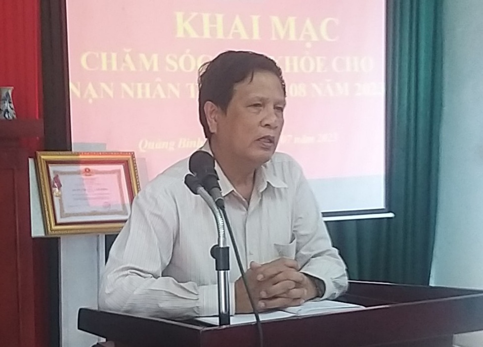 Ông Nguyễn Quốc Trị UVBCHTW Hội NNCĐDC/dioxin Việt nam, Chủ Tịch Hội NNCĐDC/dioxin tỉnh Quảng Bình phát biểu khai mạc và trao tượng trưng số tiền 105.000.000 đồng, cho hội viên thụ hưởng chi phí đợt này.