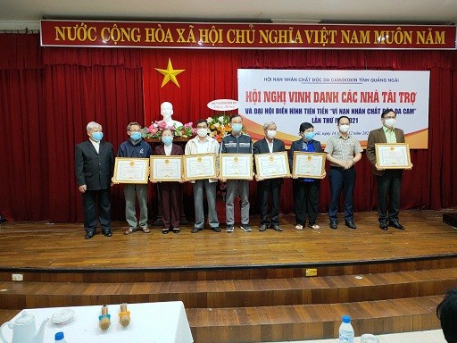 Trong 5 năm qua (2016-2021) phải đối mặt với nhiều khó khăn, thách thức như bão lụt, đại dịch Covid-19… nhưng được sự quan tâm của cấp ủy, chính quyền địa phương, sự cố gắng của cán bộ các cấp Hội, đặc biệt là sự đồng hành sẻ chia của các nhà tài trợ, các mạnh thường quân. Đã có hơn 571 tổ chức, cá nhân trong và ngoài tỉnh và 03 tổ chức phi chính phủ nước ngoài tại Việt Nam (MCC, MQI, Hội những người Nhật Bản yêu Việt Nam tỉnh Shizuoka) ủng hộ tiền, vật chất vào Quỹ Bảo trợ nạn nhân các cấp với số tiền hơn 33 tỷ đồng. Tiêu biểu là Hội CCB Công ty CP Đường Quảng Ngãi, nhóm hảo tâm của GS-TSKH-Bác sĩ Phan Thị Phi Phi , Quỹ Hỗ trợ ngư dân tỉnh Quảng Ngãi...; các ông Võ Thành Đàng, Chủ tịch HĐQT, Tổng Giám đốc Công ty CP Đường Quảng Ngãi; ông Nguyễn Hữu Tiến, Phó Tổng Giám đốc, Chủ tịch Hội CCB Công ty CP Đường Quảng Ngãi; ông Trần Ngọc Phương, Phó Tổng Giám đốc Công ty CP Đường Quảng Ngãi; ông Ngô Văn Tụ, Giám đốc Nhà máy Sữa Đậu nành Vinasoy; GS-TSKH-Bác sĩ Phan Thị Phi Phi; ông Nguyễn Hữu Thạnh thành phố Hà Nội; ông Bùi Vạn Trân, thành phố Hà Nội…