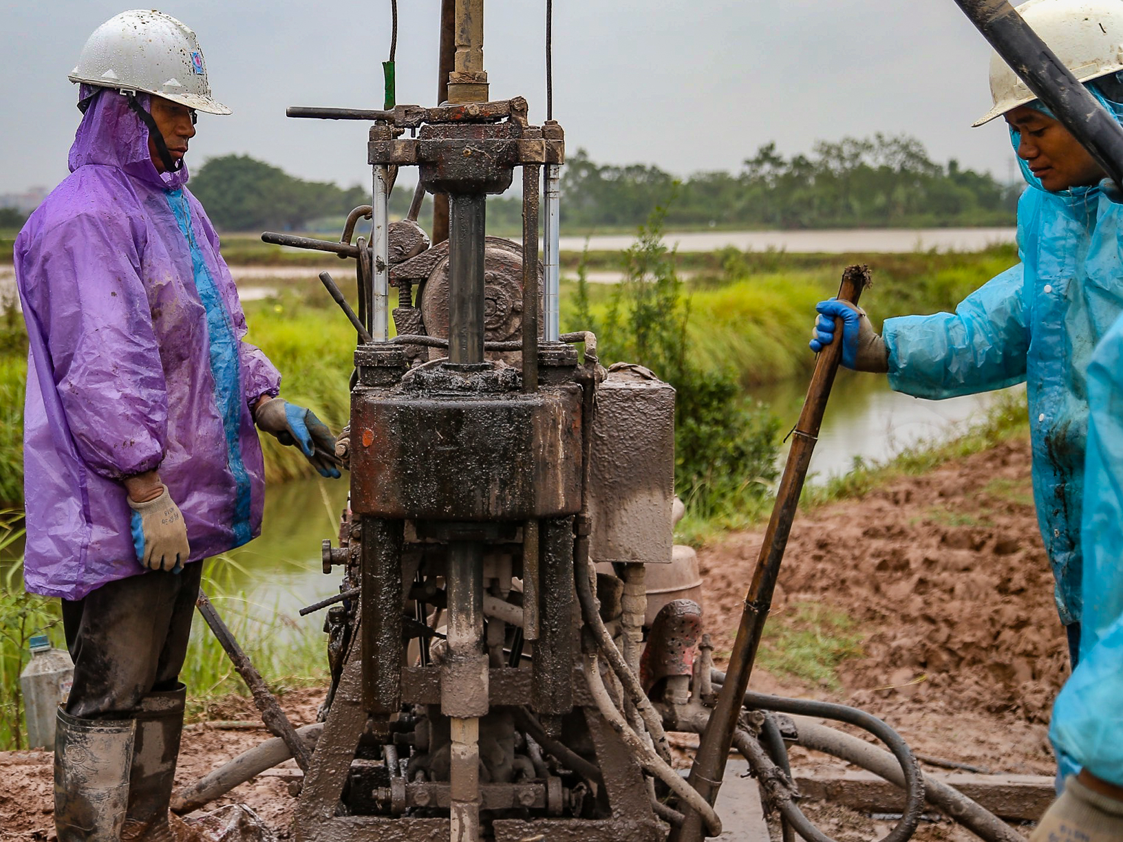 | Các mũi khoan thăm dò địa chất được tiến hành song song với khảo sát địa hình. |