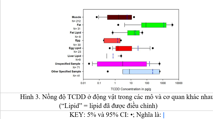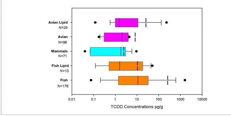 Đánh giá sơ bộ này về sự ô nhiễm TCDD đối với quần thể sinh vật ở Việt Nam tập trung vào động vật, cả động vật hoang dã và nuôi trong nhà, vì mức độ có xu hướng cao hơn mức được phát hiện ở thực vật hoặc nấm do động vật tỷ lệ lipid cao hơn và khả năng tích lũy sinh học. Chúng tôi đã xác định được mười một (11) bài báo khoa học báo cáo các phép đo TCDD trong 381 mẫu khác nhau. Lưu ý rằng mẫu có thể được lấy từ nguồn vật liệu sinh học tổng hợp từ nhiều loài động vật hoặc từ một cá thể riêng lẻ. Trong Hình 2, nồng độ TCDD được thể hiện theo nhóm phân loại. Cần lưu ý rằng những kết quả này được lấy từ nhiều nghiên cứu khác nhau và phân tích TCDD không phải lúc nào cũng được thực hiện trên cùng một loại mẫu mô như chúng ta sẽ tóm tắt trong Hình 3. Trong khi các phân tích hiệu chỉnh lipid được ưu tiên hơn, hầu hết các mẫu được đo TCDD trong mô ướt. Ví dụ, trong tổng số 121 mẫu gia cầm, có 25 mẫu đã được hiệu chỉnh lipid. Đây không phải là các mẫu được ghép nối vì vậy các phép đo TCDD trong mô ướt và được hiệu chỉnh lipid cho một cơ quan nhất định đến từ các nghiên cứu khác nhau. Như dự đoán, các giá trị nhìn chung có kết quả cao hơn sau khi hiệu chỉnh lipid. Các giá trị trung bình thấp nhất (thanh màu xanh dọc) được tìm thấy ở động vật có vú. Nồng độ TCDD cao nhất được tìm thấy ở cá, với quan sát bất ngờ rằng giá trị trung bình của cá được hiệu chỉnh lipid thấp hơn so với cá không hiệu chỉnh lipid. Điều này phản ánh tình trạng các mẫu không được ghép nối đến từ nhiều vị trí địa lý và môi trường với các mức độ ô nhiễm khác nhau. Trên thực tế, nồng độ cao nhất của TCDD được báo cáo là một phép đo không hiệu chỉnh lipid là 3990 pg/g được đo ở cá.