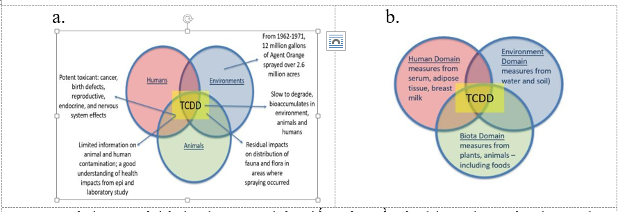 Tại đây, khuôn khổ tiếp cận về sức khỏe được đưa vào vận hành bằng cách sử dụng các phép đo TCDD được thực hiện trong mô người, động vật, thực vật, đất và nước từ những năm 1970. Các nguồn dữ liệu hiện được sắp xếp thành một cơ sở dữ liệu được gọi là “Công cụ đánh giá ô nhiễm dioxin tại Việt Nam (DCVT)” được chia thành các miền: con người, sinh vật (bao gồm bao gồm động vật, thực vật, nấm) và môi trường.