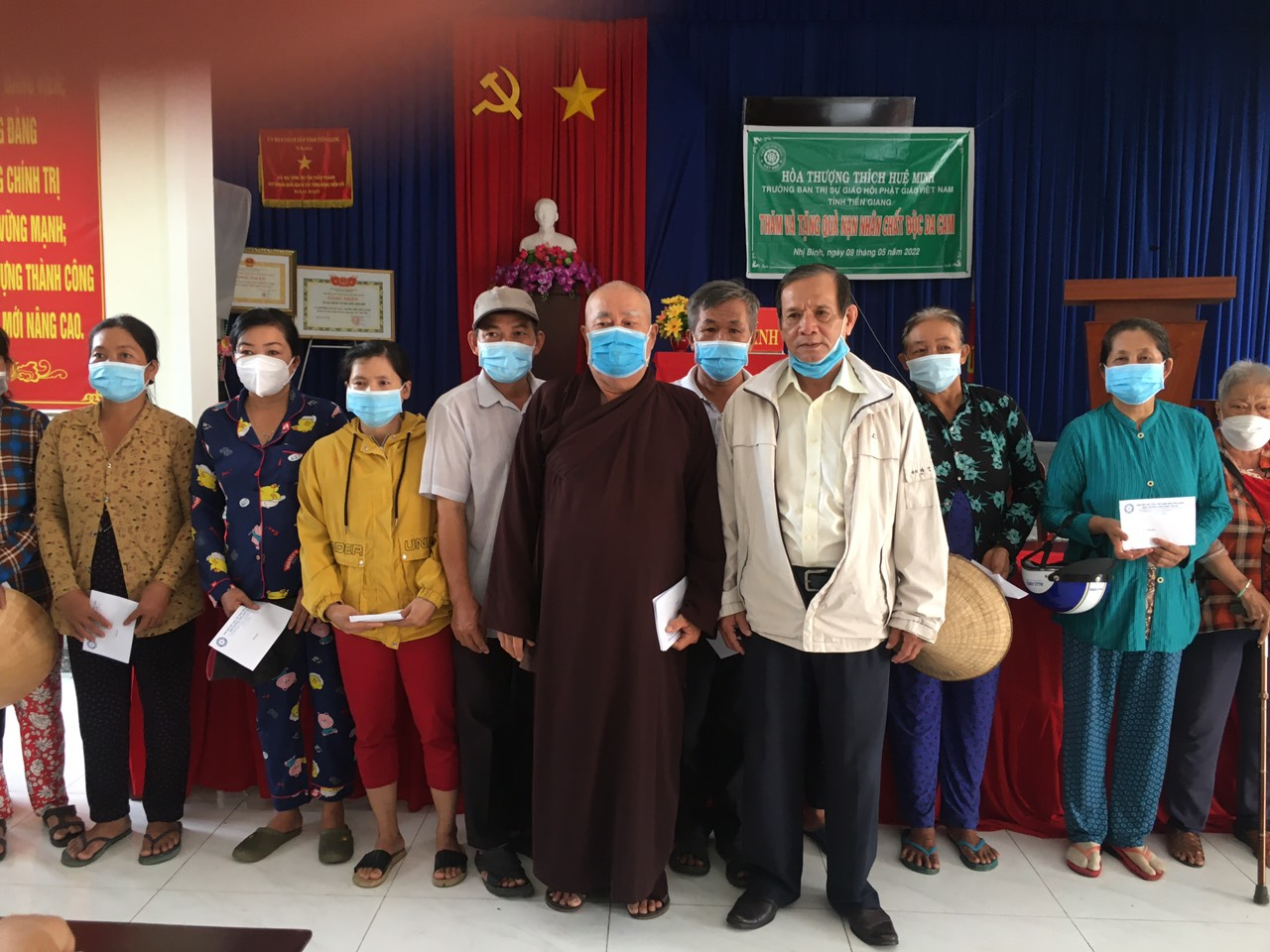 Hòa thượng Thích Huệ Minh cùng Thường vụ Hội huyện Châu Thành tặng quà nạn nhân