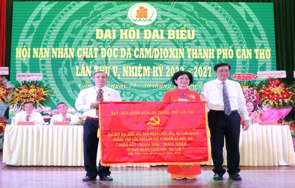 Ông Phạm Văn Hiểu, Phó Bí thư Thường trực Thành uỷ, Chủ tịch HĐND thành phố trao tặng Bức chướng "ĐOÀN KẾT-NGHĨA TÌNH- TRÁCH NHIỆM-VÌ NẠN NHÂN CHẤT ĐỘC DA CAM" cho Hội NNCĐDC/dioxin thành phố, nhân dịp Đại hội lần thứ V, nhiệm kỳ 2022-2027