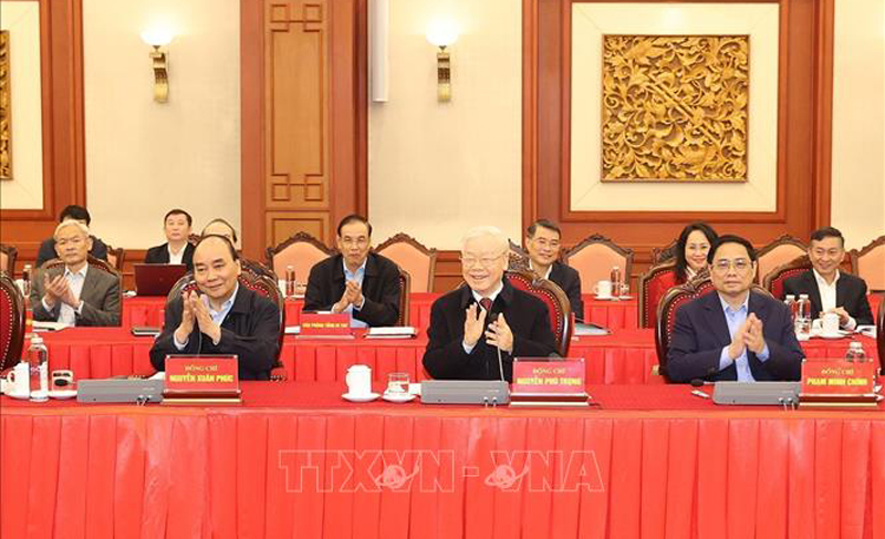 Tổng Bí thư Nguyễn Phú Trọng chủ trì buổi làm việc với Ban Thường vụ Thành ủy thành phố Hồ Chí Minh. Ảnh: Trí Dũng/TTXVN