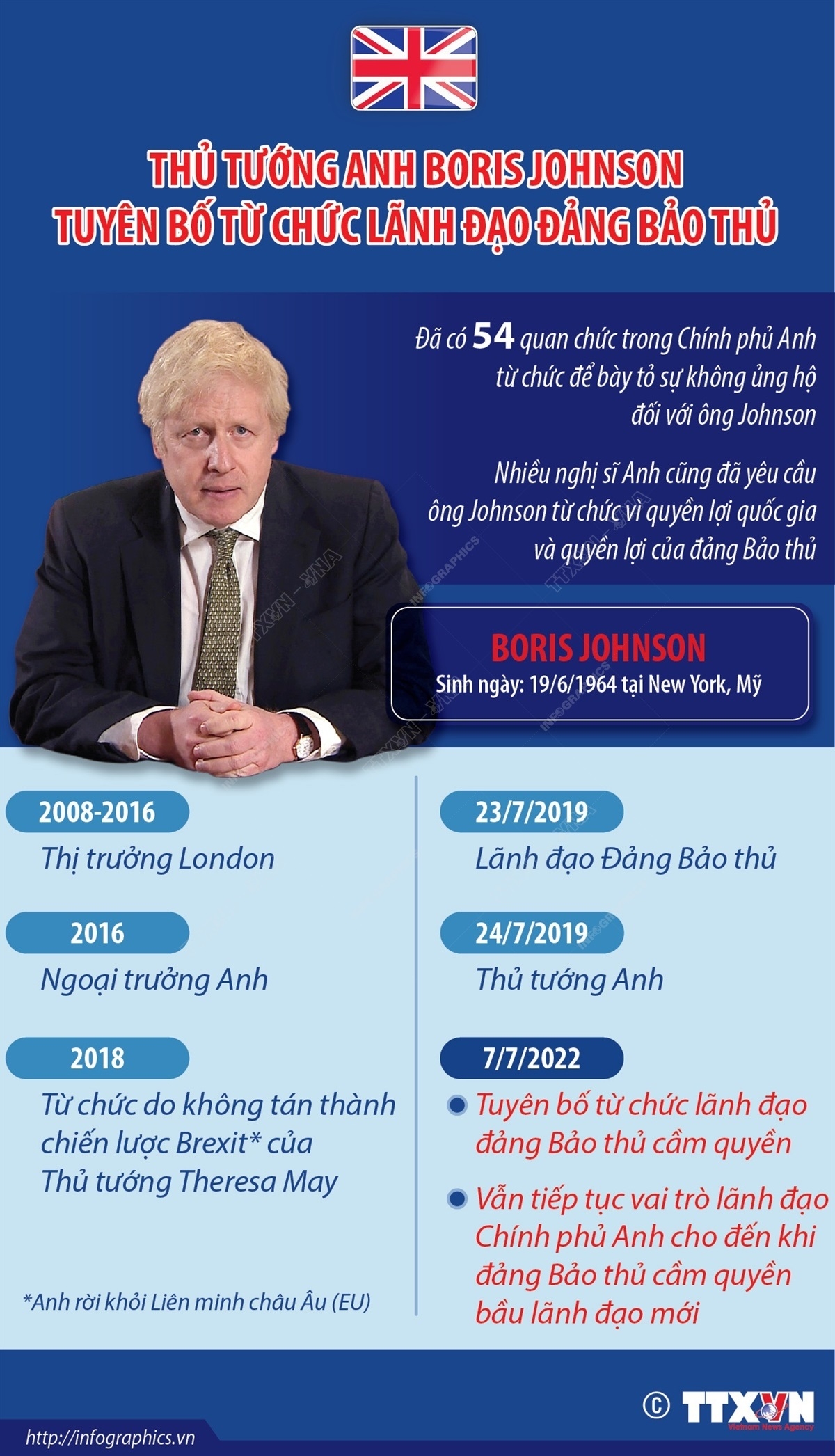 Ngày 7/7/2022, Thủ tướng Anh Boris Johnson đã thông báo từ chức lãnh đạo đảng Bảo thủ cầm quyền. Ông Johnson sẽ vẫn tiếp tục vai trò lãnh đạo Chính phủ Anh cho đến khi đảng Bảo thủ cầm quyền bầu lãnh đạo mới vào mùa Thu tới.