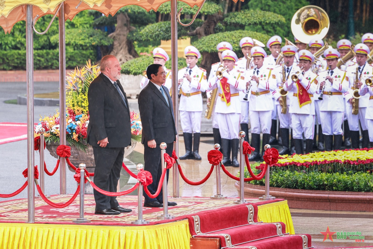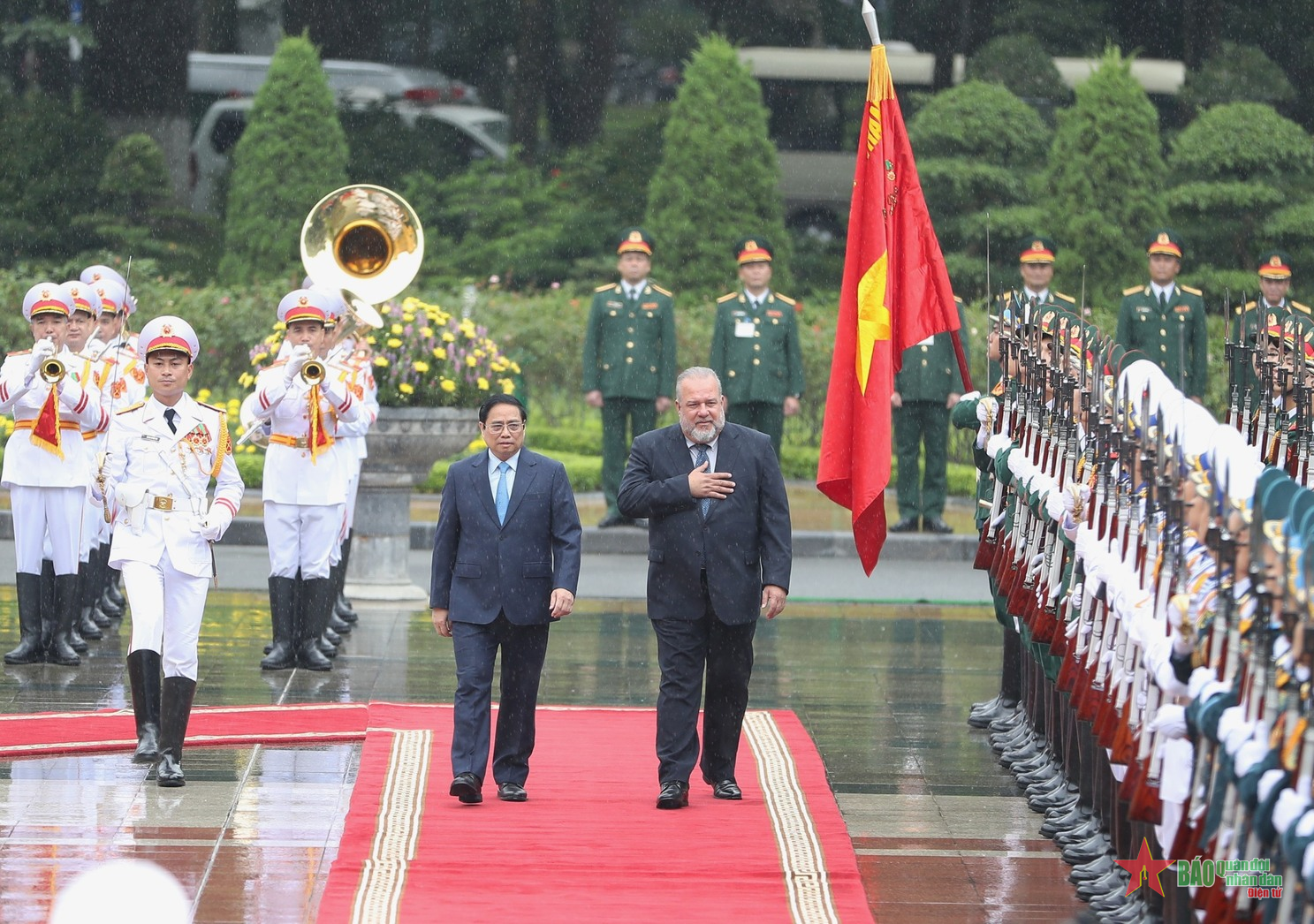 Khi hai Thủ tướng bước lên bục danh dự, dưới quốc kỳ hai nước, Quốc thiều hai nước đã được cử lên trang nghiêm. Thủ tướng Phạm Minh Chính mời Thủ tướng Cuba Manuel Marrero Cruz duyệt Đội danh dự Quân đội nhân dân Việt Nam; sau đó hai nhà lãnh đạo giới thiệu thành phần Đoàn cấp cao hai bên tham dự lễ đón.