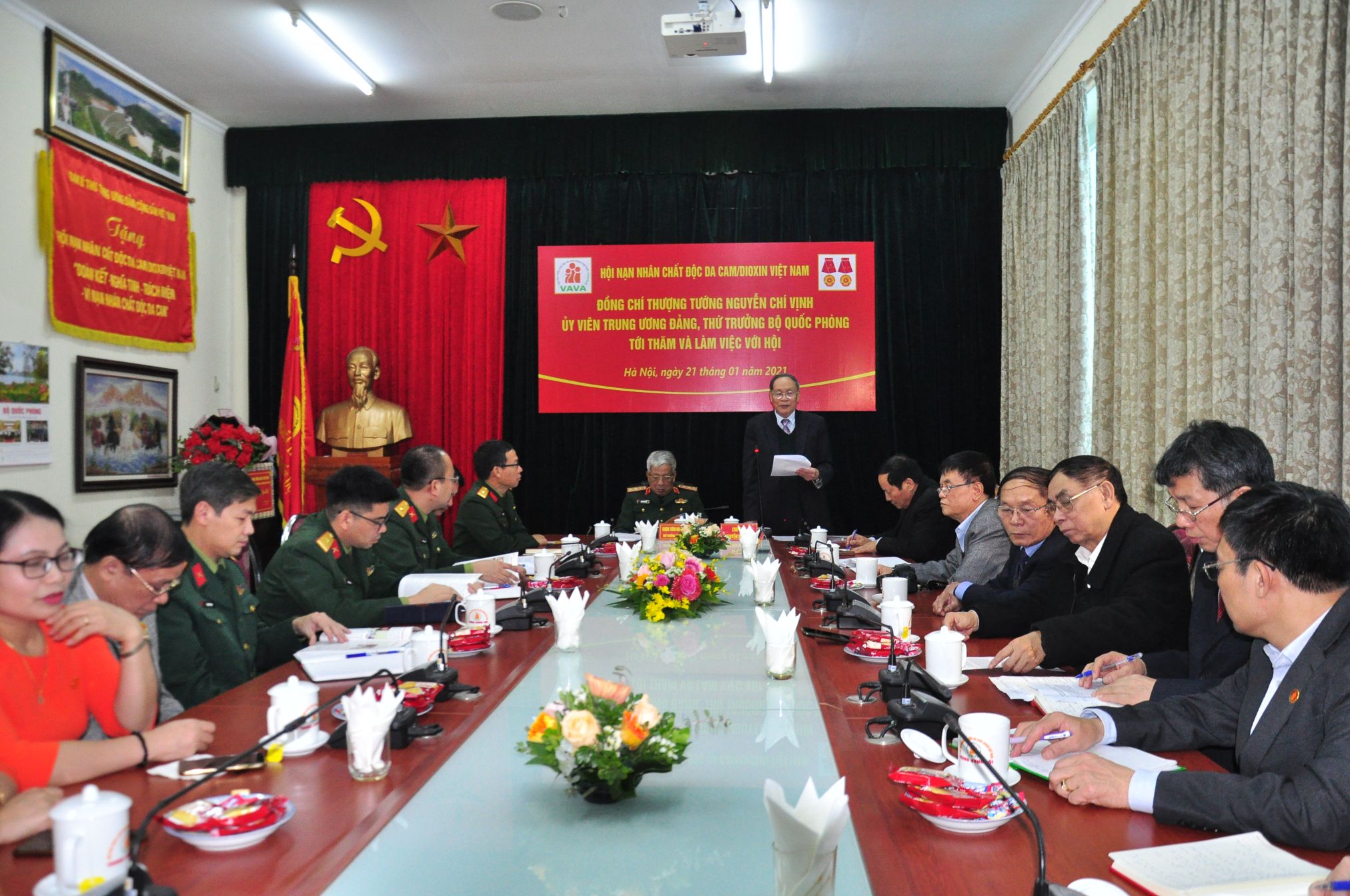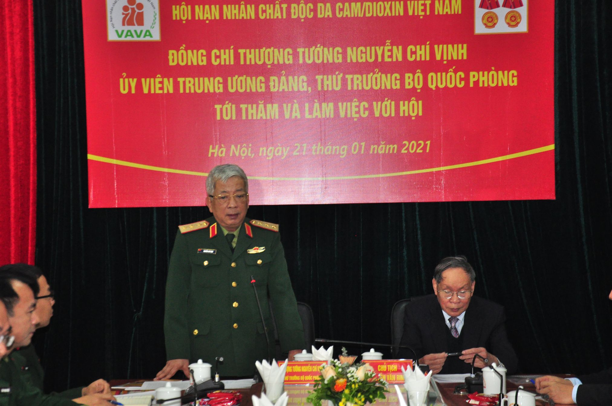 Phát biểu trong buổi đến thăm và làm việc, Thượng tướng Nguyễn Chí Vịnh đã thông báo một số kết quả đạt được trong công tác khắc phục hậu quả bom mìn, chất độc hóa học do quân đội Mỹ sử dụng trong chiến tranh ở Việt Nam. Quân đội đã tích cực triển khai nhiệm vụ rà soát bom mìn, tẩy độc. Tuy nhiên, do số lượng bom mìn, vật nổ lớn, khu vực bị ô nhiễm chất độc hóa học rộng, địa hình phức tạp, nên nhiệm vụ này còn rất nặng nề. Chúng ta quyết tâm đến năm 2030 cơ bản làm sạch chất độc dioxin; đến năm 2045 cơ bản sạch bom mìn, chất nổ. Đồng chí cũng cho biết: gần đây, nhận thức của Hoa Kỳ về trách nhiệm khắc phục hậu quả bom, mìn, chất độc hóa học ở Việt Nam đã có chuyển biến; hằng năm đã hỗ trợ hàng trăm triệu USD cho nhiệm vụ này. Về công tác đấu tranh đòi công lý cho nạn nhân, đồng chí Thứ trưởng nhấn mạnh yêu cầu: phải kiên trì vận động, đấu tranh, tích cực ủng hộ các vụ kiện đòi công lý cho NNCĐDC.