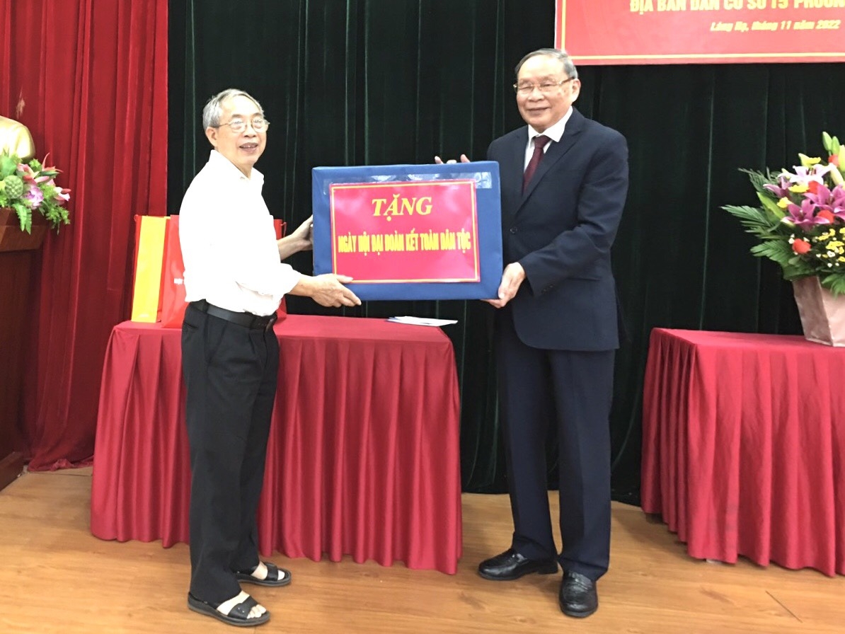 Hôm nay, trong không khí tưng bừng kỷ niệm 92 năm Ngày truyền thống của MTTQ Việt Nam (18/11/1930 - 18/11/2022), gắn với Ngày hội Đại đoàn kết toàn dân tộc, theo sự giới thiệu và phân công của Ban Thường trực Ủy ban Trung ương MTTQ Việt Nam, tôi rất phấn khởi được về dự Ngày hội Đại đoàn kết toàn dân tộc tại Tổ dân phố 20, Khu dân cư 15, phường Láng Hạ, quận Đống Đa, thành phố Hà Nội; đồng thời trao quà của Ban Thường trực Ủy ban Trung ương MTTQ Việt Nam tặng Tổ dân phố và 5 hộ gia đình tiêu biểu.