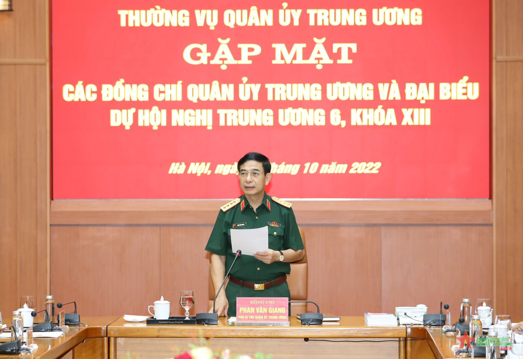 Phát biểu tại buổi gặp mặt, Đại tướng Phan Văn Giang, Ủy viên Bộ Chính trị, Phó bí thư Quân ủy Trung ương, Bộ trưởng Bộ Quốc phòng thông báo tóm tắt về kết quả thực hiện công tác quân sự, quốc phòng thời gian qua; đồng thời yêu cầu các đồng chí Quân ủy Trung ương và các đồng chí dự hội nghị thường xuyên nắm chắc tình hình, nhất là những nội dung có liên quan, tác động đến nhiệm vụ quân sự, quốc phòng; tập trung lãnh đạo, chỉ đạo việc phối hợp với các ban, bộ, ngành, địa phương trong thực hiện các mục tiêu về xây dựng, củng cố quốc phòng, an ninh; hoàn thành tốt chương trình, kế hoạch huấn luyện năm 2022.