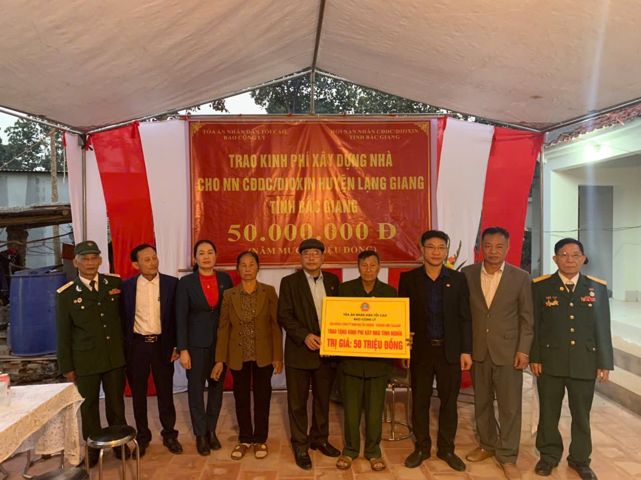 Thực hiện kế hoạch xóa nhà tạm, nhà dột nát của UBND tỉnh Bắc Giang năm 2024, thông qua Hội NNCĐDC/dioxin tỉnh Bắc Giang; Trung tâm Nhân đạo Phú Quý; Báo Công lý, Tòa án Nhân dân tối cao đã vận động các nhà tài trợ, hỗ trợ kinh phí để xây dựng mới và sửa chữa 8 căn nhà tình nghĩa cho gia đình NNCĐDC có hoàn cảnh khó khăn tại các huyện: Lục Ngạn, Hiệp Hòa, Lạng Giang, Yên Dũng, Lục Nam và thị xã Việt Yên; mỗi gia đình được hỗ trợ 50 triệu đồng và một phần quà giá trị 2 triệu đồng gồm: nồi cơm điện; bộ nồi inox, ấm siêu tốc và chăn ấm; tổng số tiền hỗ trợ xây dựng nhà ở và quà là 416 triệu đồng.