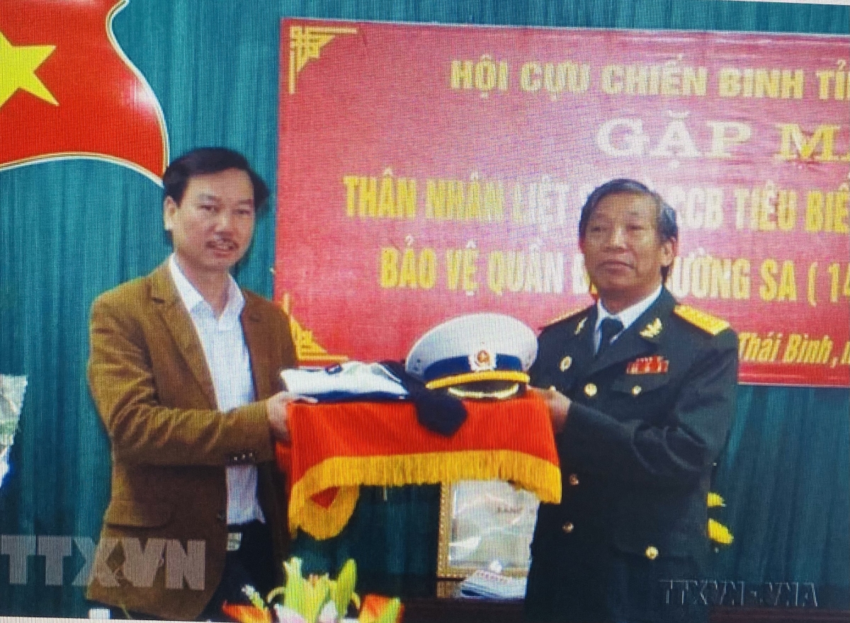 | Đại tá Nguyễn Văn Hán- Chủ tịch Hội CCB tỉnh Thái Bình thay mặt trao kỷ vật của thuyền trưởng Vũ Huy Lễ tặng Bảo tàng tỉnh Thái Bình (bộ quân phục ông Lễ mặc chỉ huy bộ đội chiến đấu ngày 14/3/1988 tại Quần đảo Trường Sa) |