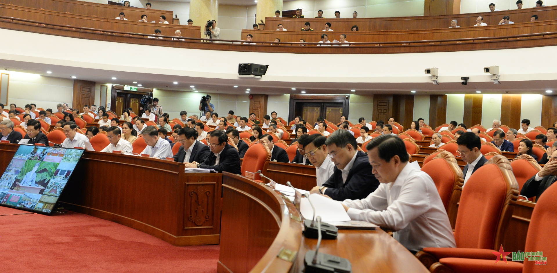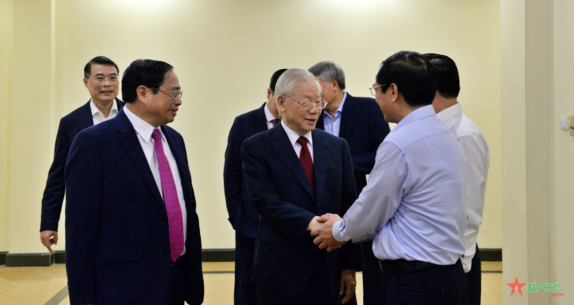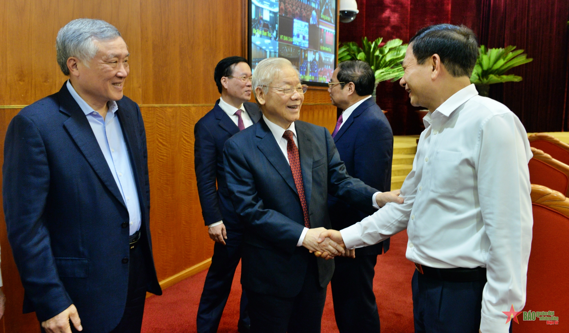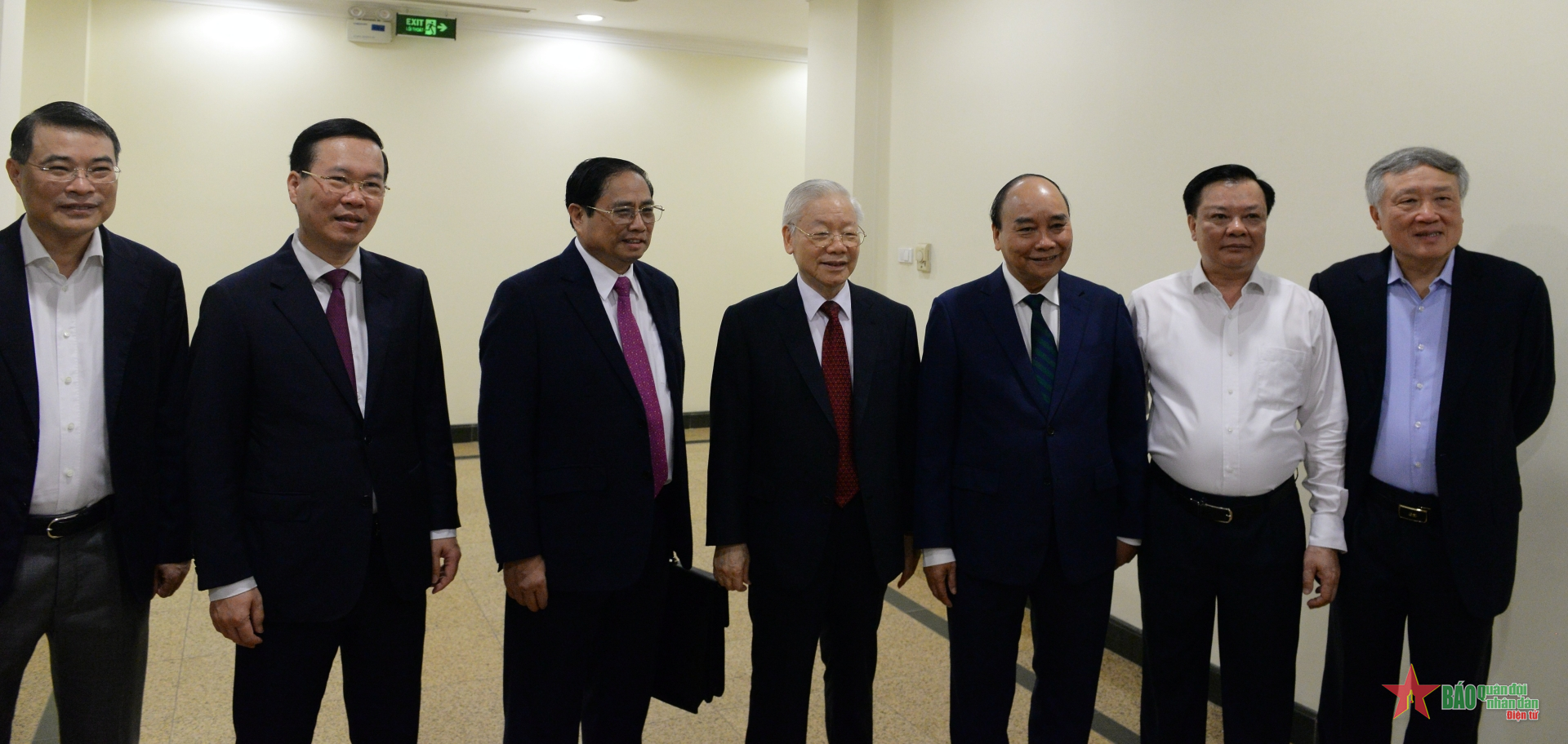 Đồng chủ trì hội nghị có các đồng chí Ủy viên Bộ Chính trị: Chủ tịch nước Nguyễn Xuân Phúc, Thủ tướng Chính phủ Phạm Minh Chính, Thường trực Ban Bí thư Võ Văn Thưởng.