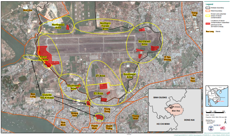 Theo kết quả đánh giá toàn diện nhất về ô nhiễm dioxin tại khu vực Sân bay Biên Hòa của USAID và Bộ Quốc phòng Việt Nam (hình 2) cho thấy, tổng lượng đất và trầm tích nhiễm dioxin ước tính khoảng từ 408.500 m3 đến 495.300m3. Trong đó, 95% đất và trầm tích bị nhiễm nằm trong sân bay, tập trung ở khu Pacer Ivy (40 %), Z1 (30 %) và Tây Nam (10 %) [5].