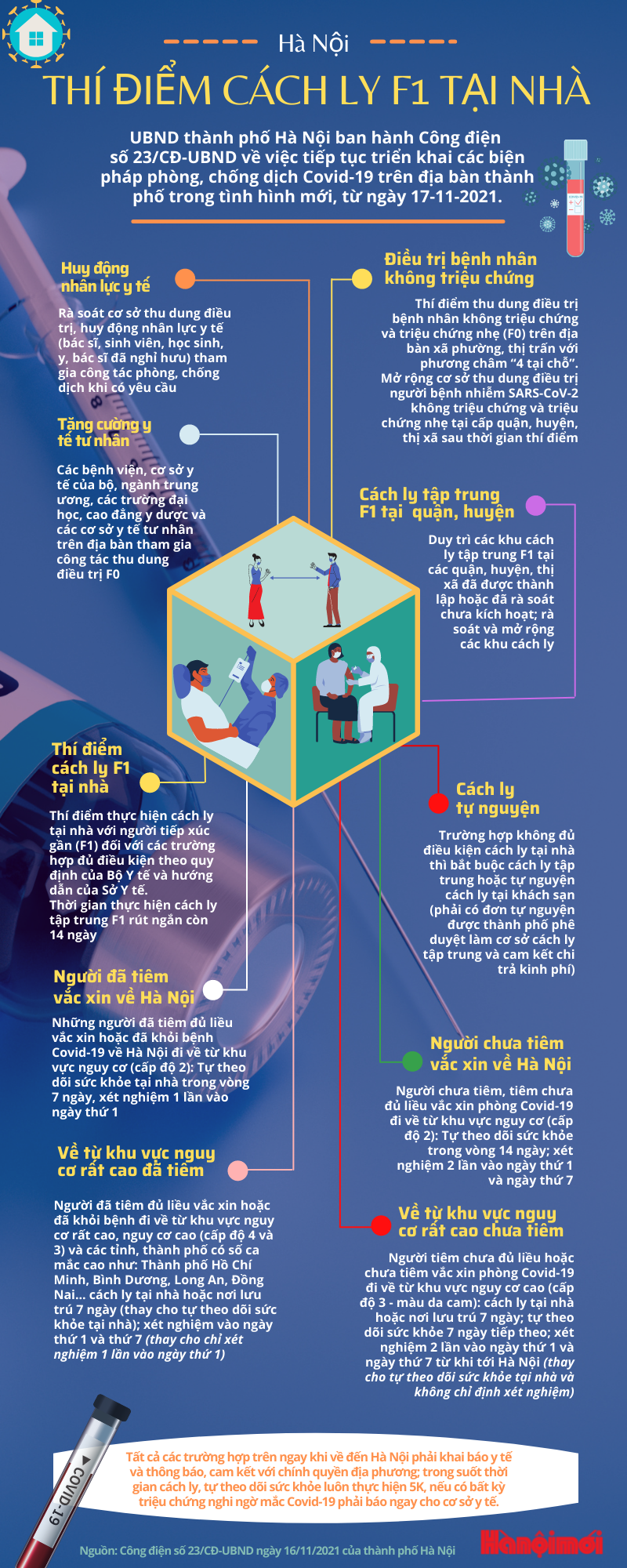 UBND thành phố Hà Nội ban hành Công điện số 23/CĐ-UBND về việc tiếp tục triển khai các biện pháp phòng, chống dịch Covid-19 trên địa bàn thành phố trong tình hình mới, thực hiện từ ngày 17-11-2021. Theo đó, sẽ thí điểm thực hiện cách ly tại nhà với người tiếp xúc gần (F1) đủ điều kiện theo quy định của Bộ Y tế và hướng dẫn của Sở Y tế. Thời gian thực hiện cách ly tập trung F1 rút ngắn còn 14 ngày...