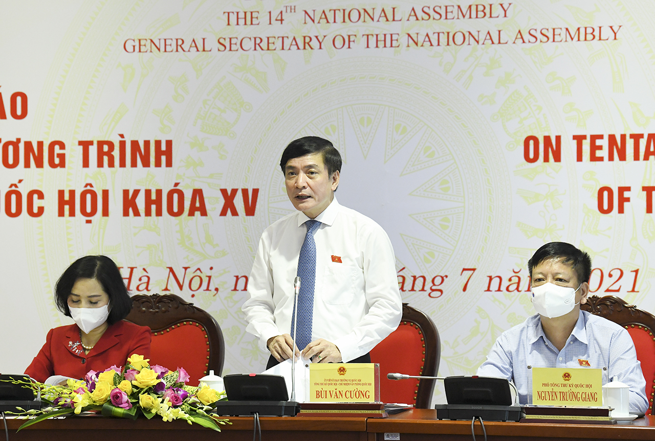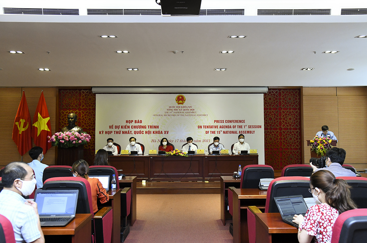 Tại buổi họp báo, Phó Chủ nhiệm Văn phòng Quốc hội Vũ Minh Tuấn giới thiệu chương trình và nội dung Kỳ họp thứ Nhất, Quốc hội khóa XV và cho biết, Kỳ họp thứ nhất, Quốc hội khóa XV sẽ khai mạc vào ngày 20/7/2021 tại Nhà Quốc hội, Thủ đô Hà Nội. Theo dự kiến chương trình, Quốc hội sẽ họp tập trung trong thời gian 11,5 ngày (dự kiến bế mạc vào ngày 31/7/2021). Để tổ chức thành công kỳ họp thứ nhất, Quốc hội khóa XV, thời gian qua, UBTVQH đã chỉ đạo các cơ quan của Quốc hội, Tổng Thư ký Quốc hội chuẩn bị chu đáo nội dung, chương trình kỳ họp; các điều kiện bảo đảm và phương thức tổ chức kỳ họp trong bối cảnh đại dịch Covid-19 diễn biến phức tạp.
