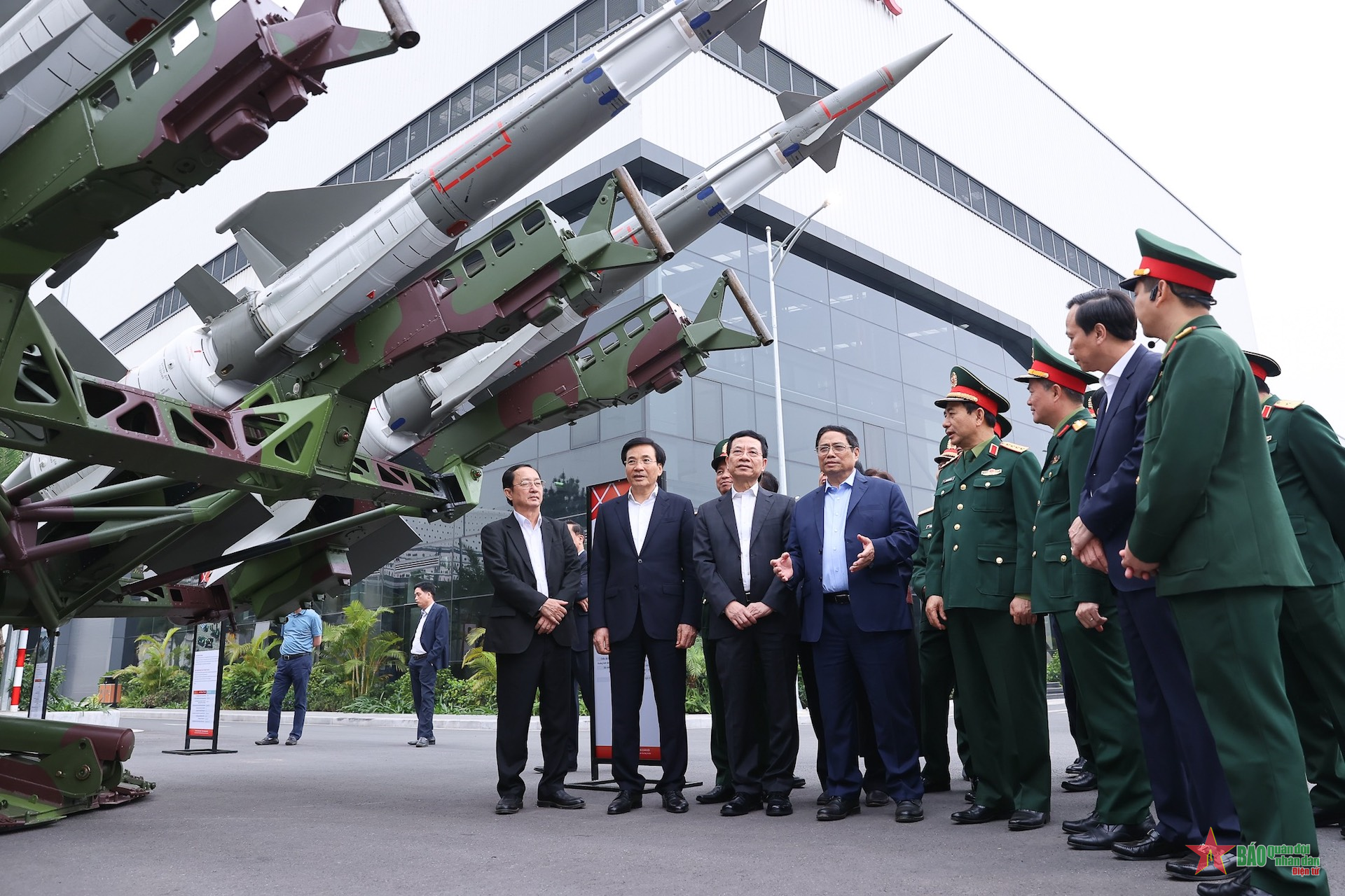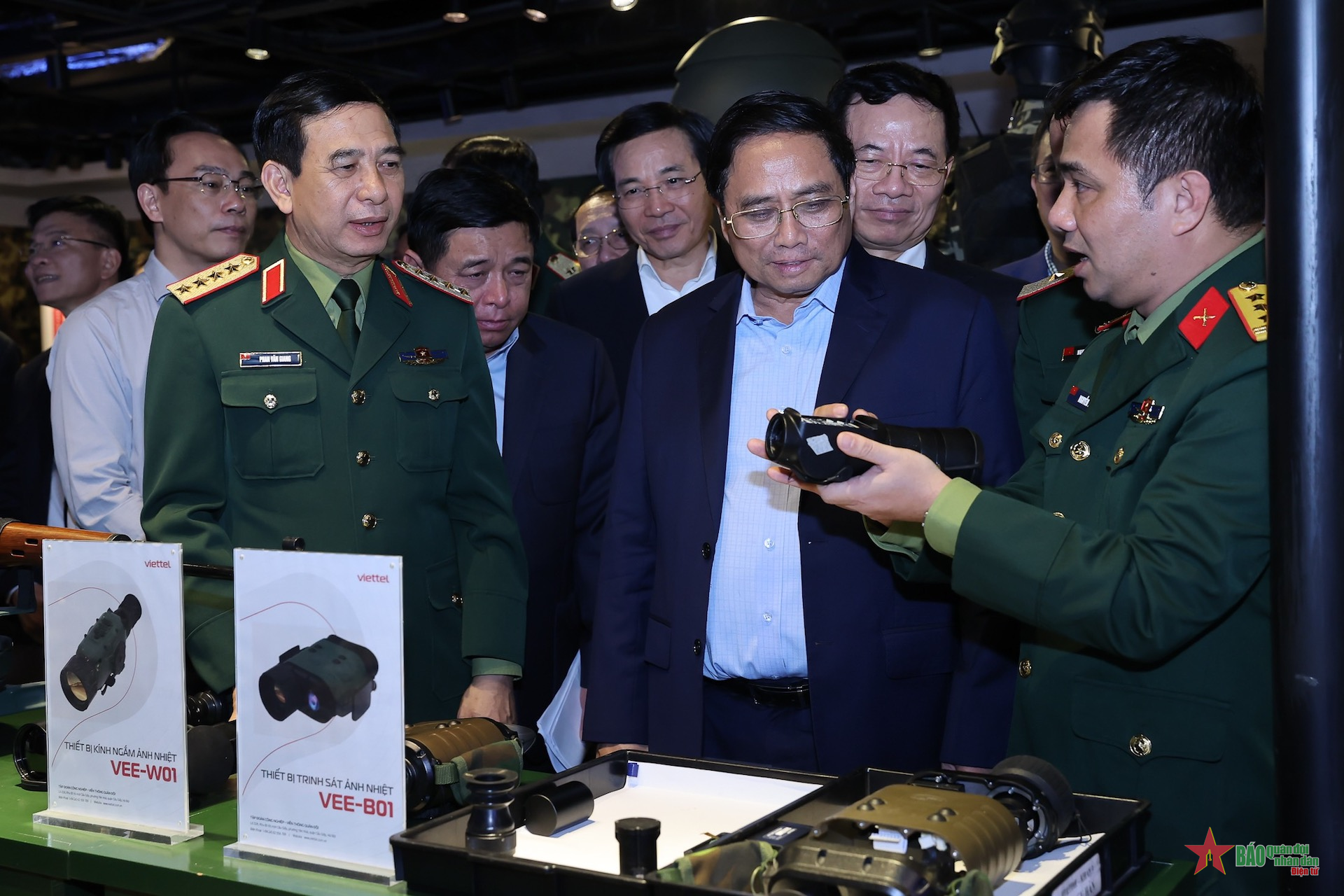 | Thủ tướng Phạm Minh Chính và Đại tướng Phan Văn Giang, Uỷ viên Bộ Chính trị, Phó Bí thư Quân uỷ Trung ương, Bộ trưởng Bộ Quốc phòng cùng các đại biểu tham quan các sản phẩm công nghiệp quốc phòng do Viettel nghiên cứu, phát triển. Ảnh do Viettel cung cấp. |